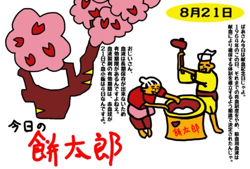 今日は何の日? 8月21日は献血記念日 1964年のこの日、それまでの売血制度をやめ、輸血用血液は献血により確保する体制を確立するよう閣議で決定されました。 1974年に民間商業血液銀行が預血制度を廃止したことにより、すべてを献血で確保する体…