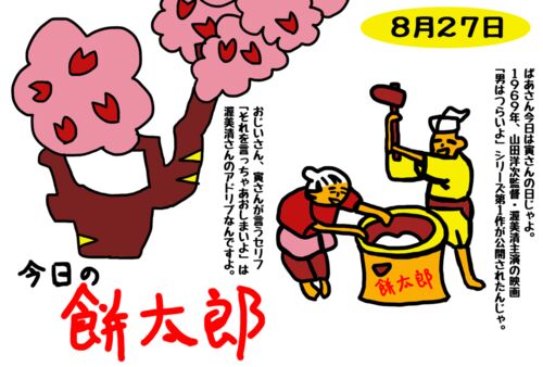 今日は何の日? 8月27日は寅さんの日 1969年、山田洋次監督・渥美清主演の映画『男はつらいよ』シリーズの第1作が公開されました。 『男はつらいよ』は、渥美清主演、山田洋次原作・監督(一部作品除く)のテレビドラマおよび映画です。 テキ屋稼業…